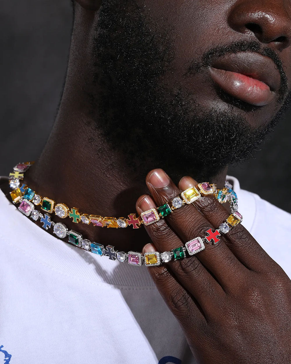 MOISSANITE CROSS & GEMSTONES CHAIN. - WHITE GOLD
