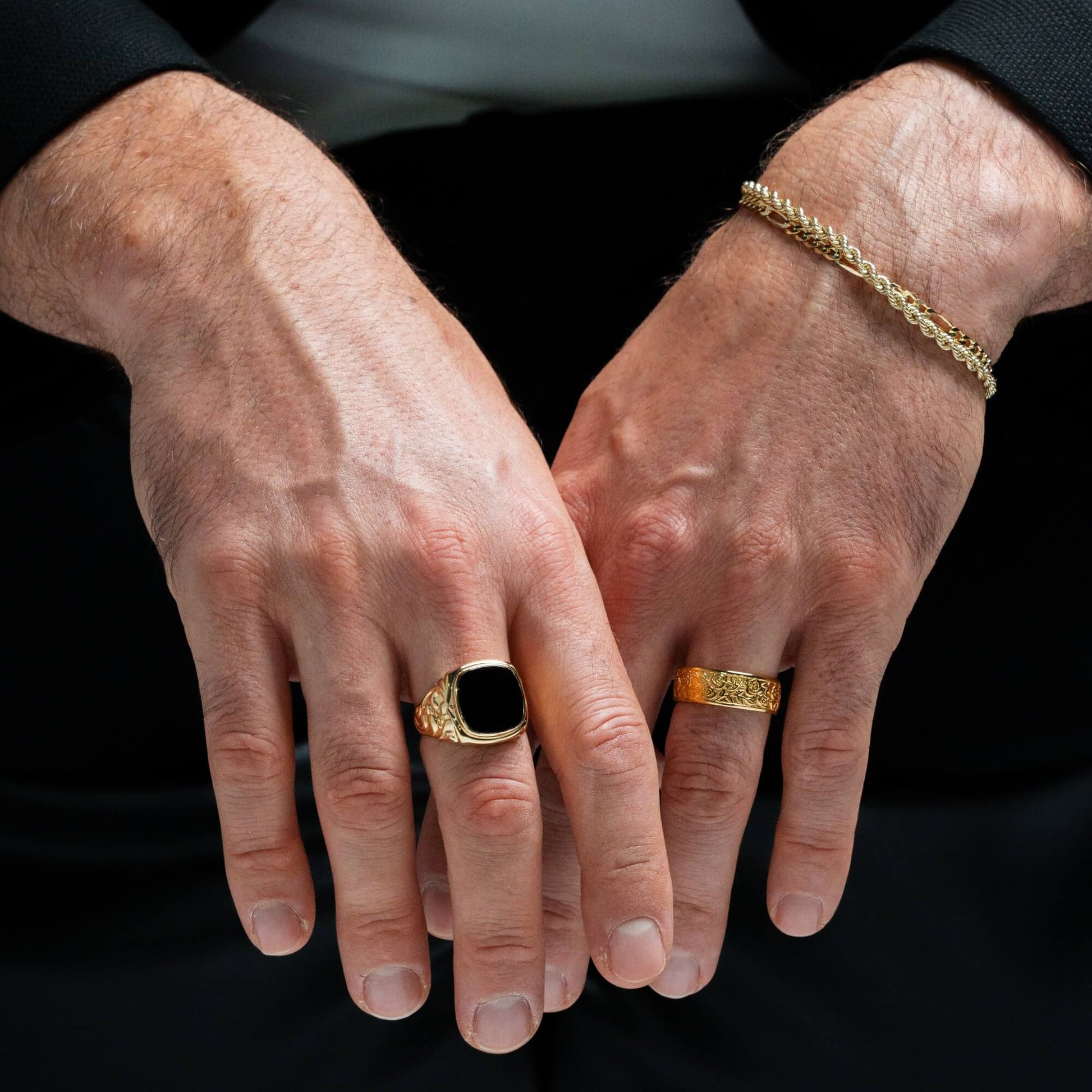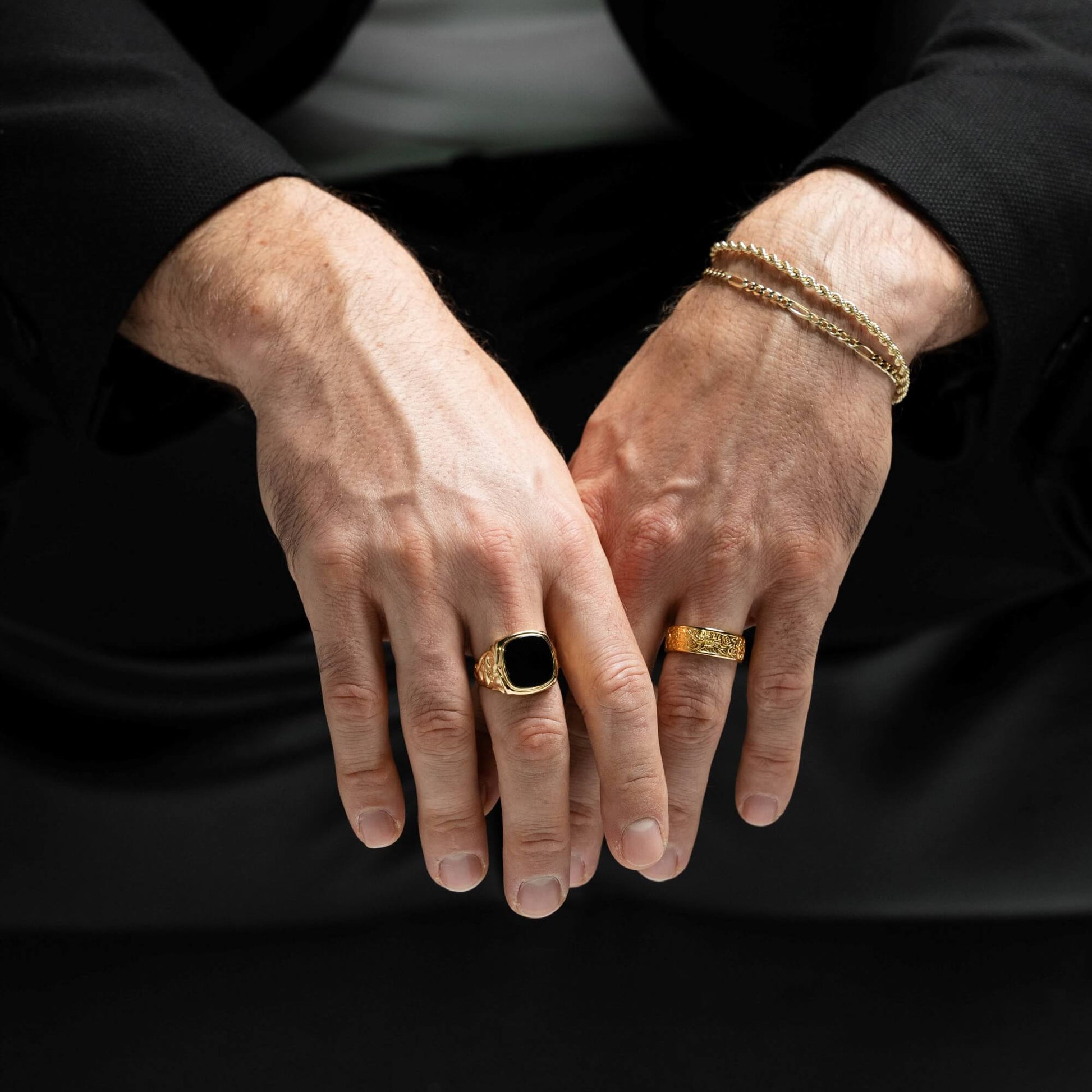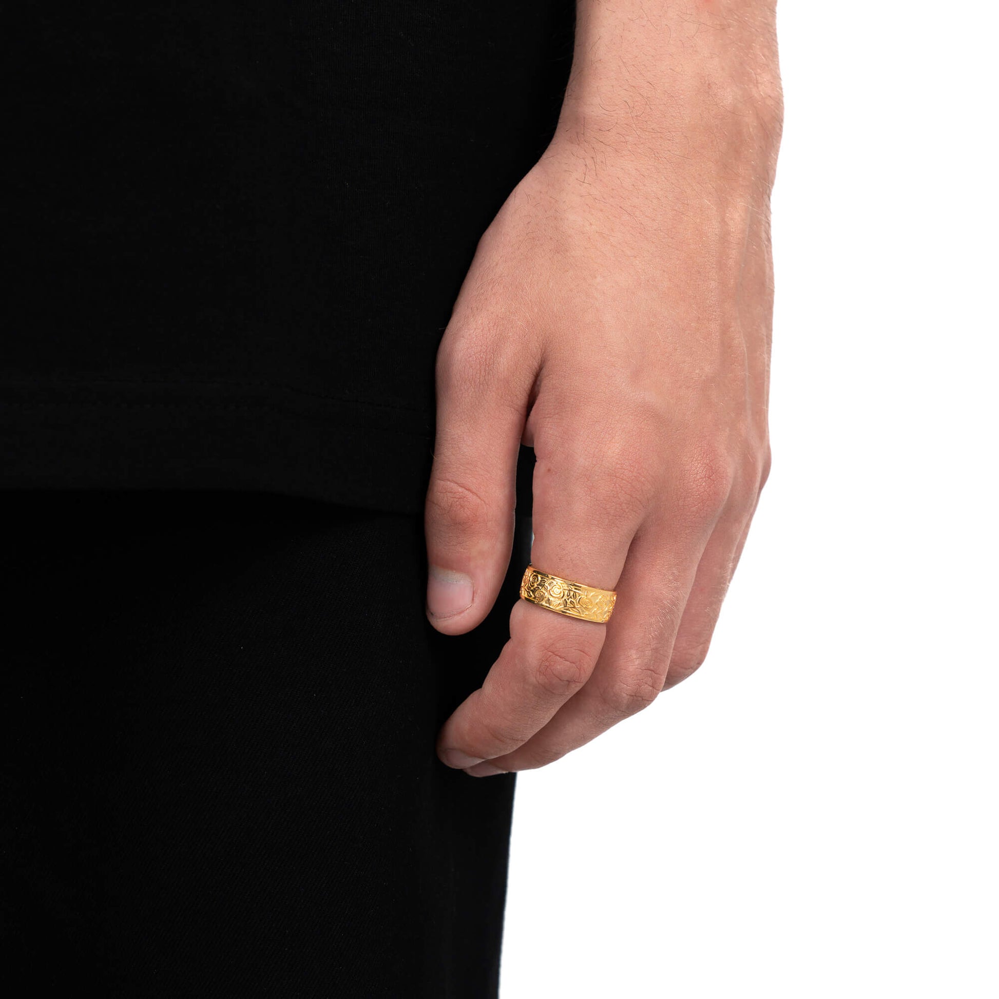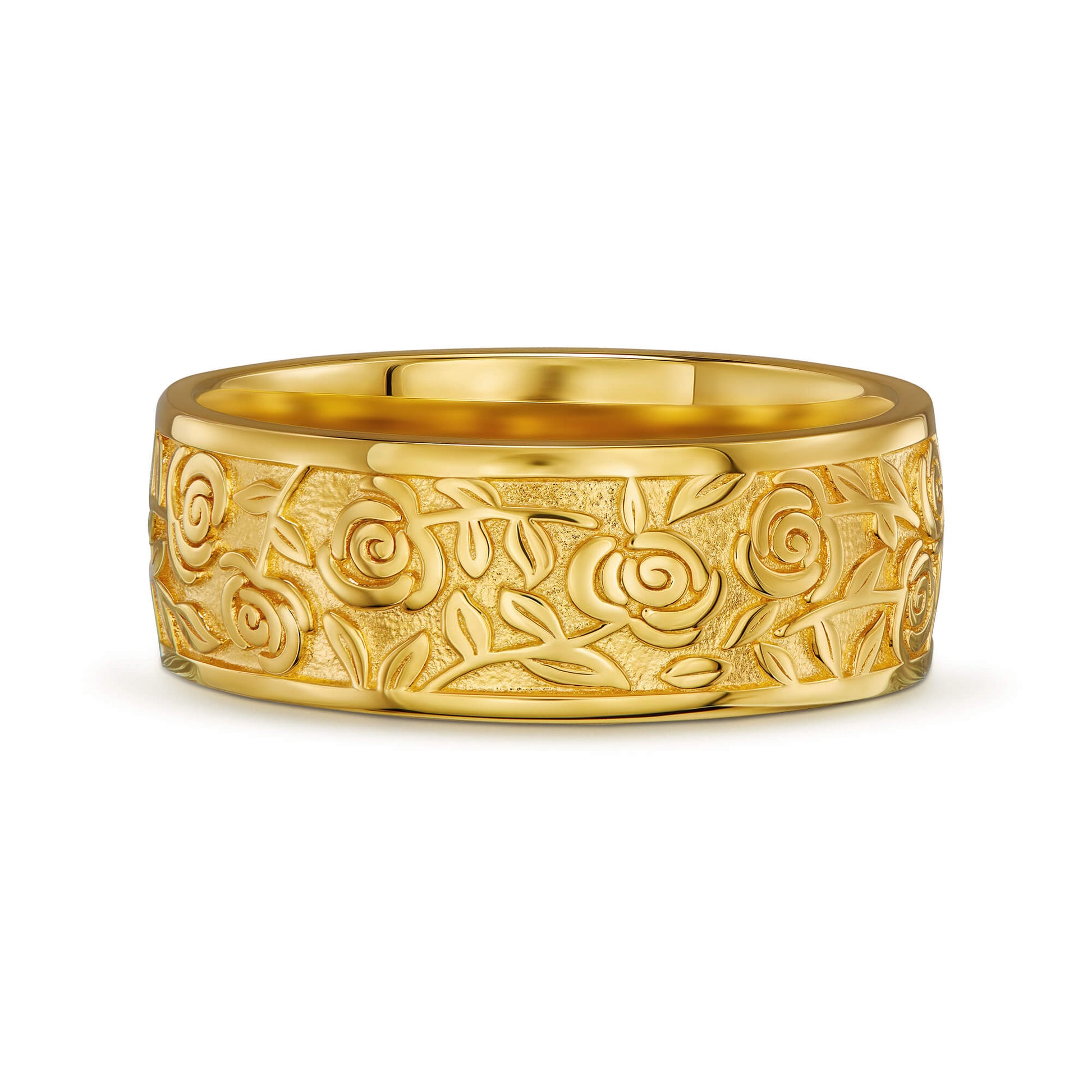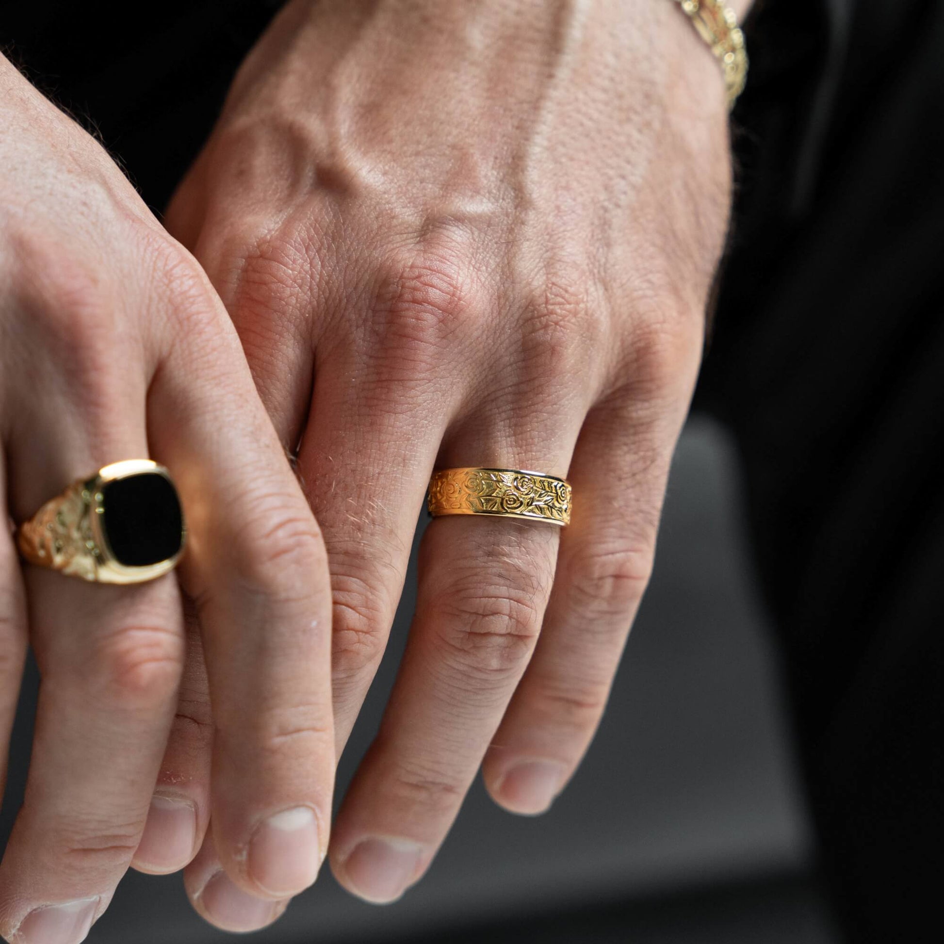 Dieser breite Ring vereint florale Eleganz mit kraftvollem Design. Das kunstvoll gravierte Rosenmuster auf sattem Goldton sorgt für einen Look, der auffällt – ohne zu überladen. Perfekt für alle, die Stärke mit Stil verbinden und ein echtes Statement setzen wollen.